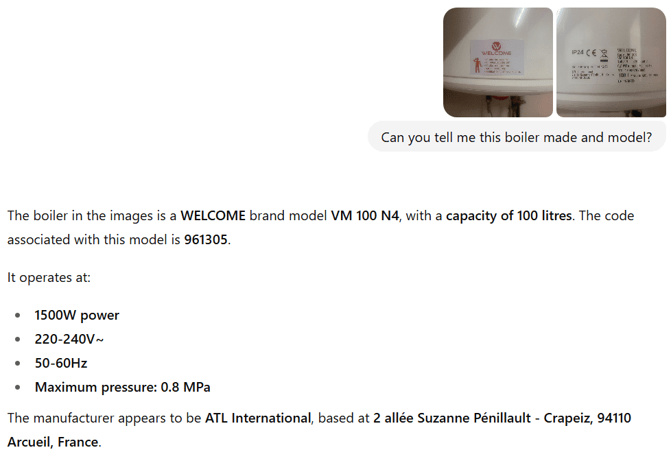 ChatGPT asked for the boiler make and model. I was in a rented house with no idea what we had. “Can I take a photo of the boiler to understand its energy usage?” I asked.