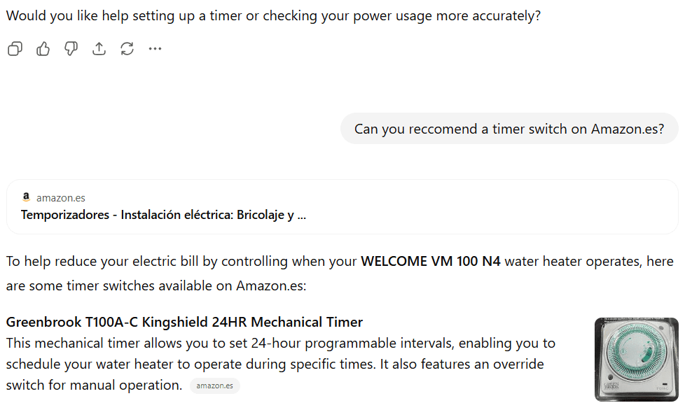 The boiler had very little information visible and few controls, so I photographed the specification stickers – making sure to frame clearly and capture any brand names, model numbers, and technical details visible. From just those photos, ChatGPT immediately identified it as a WELCOME VM 100 N4 with 1500W power consumption, confirmed this was likely the source of our high usage, and then – without me asking – suggested timer plugs as a solution.