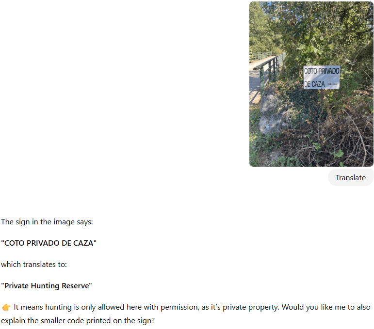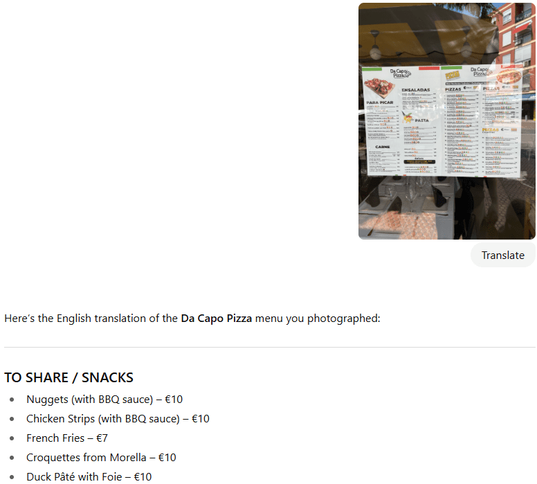 Living in Spain with limited Spanish has taught me that traditional translation apps often miss context and nuance. Photo prompting with ChatGPT (which excels at text extraction from images) delivers more accurate, contextual translations. My approach is simple: photograph any text I need translated, upload to ChatGPT with “Translate” or a specific question, then discuss further if I need clarification.