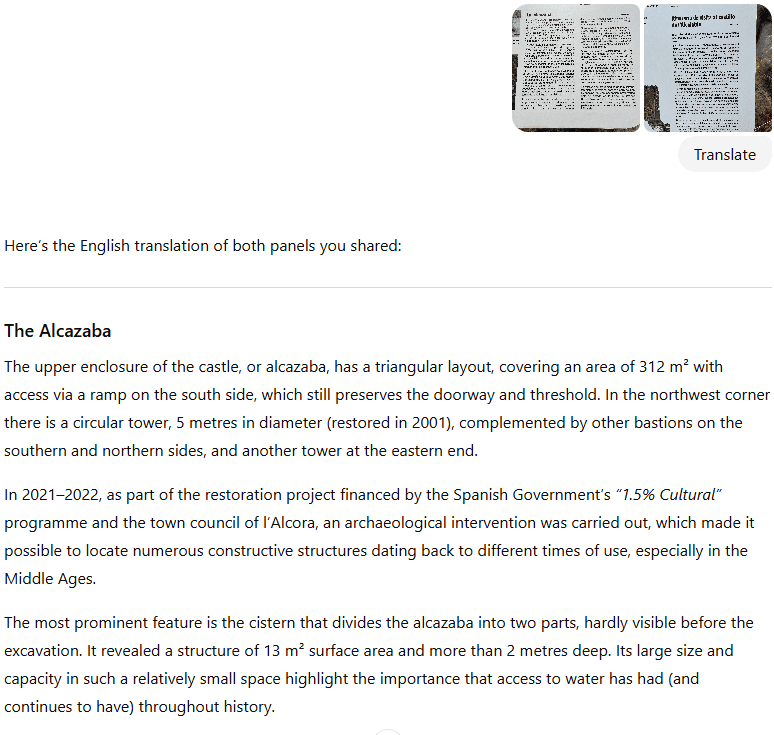 So I quickly took my phone, would snap a shot of the information board and submit to ChatGPT with the instruction “Translate” and it would extract all the text and translate it. Then I could ask ChatGPT further questions about the text or the castle or the location and essentially create my own tour guide. In one of the castles I really delved into the crusades and cross compared with an English history book I was reading. All of that from just one photo.