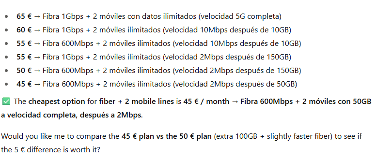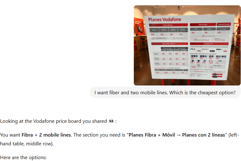 Another breakthrough came when selecting an internet package. Vodafone displayed a comprehensive grid of packages outside their shop, but the Spanish terminology wasn’t entirely clear. I photographed the options, explained my requirements to ChatGPT, asked about better alternatives, and requested analysis of my specific needs. This preparation meant I entered the shop knowing exactly what I wanted. When sales staff attempted upselling, I understood the genuine pros and cons of each option.