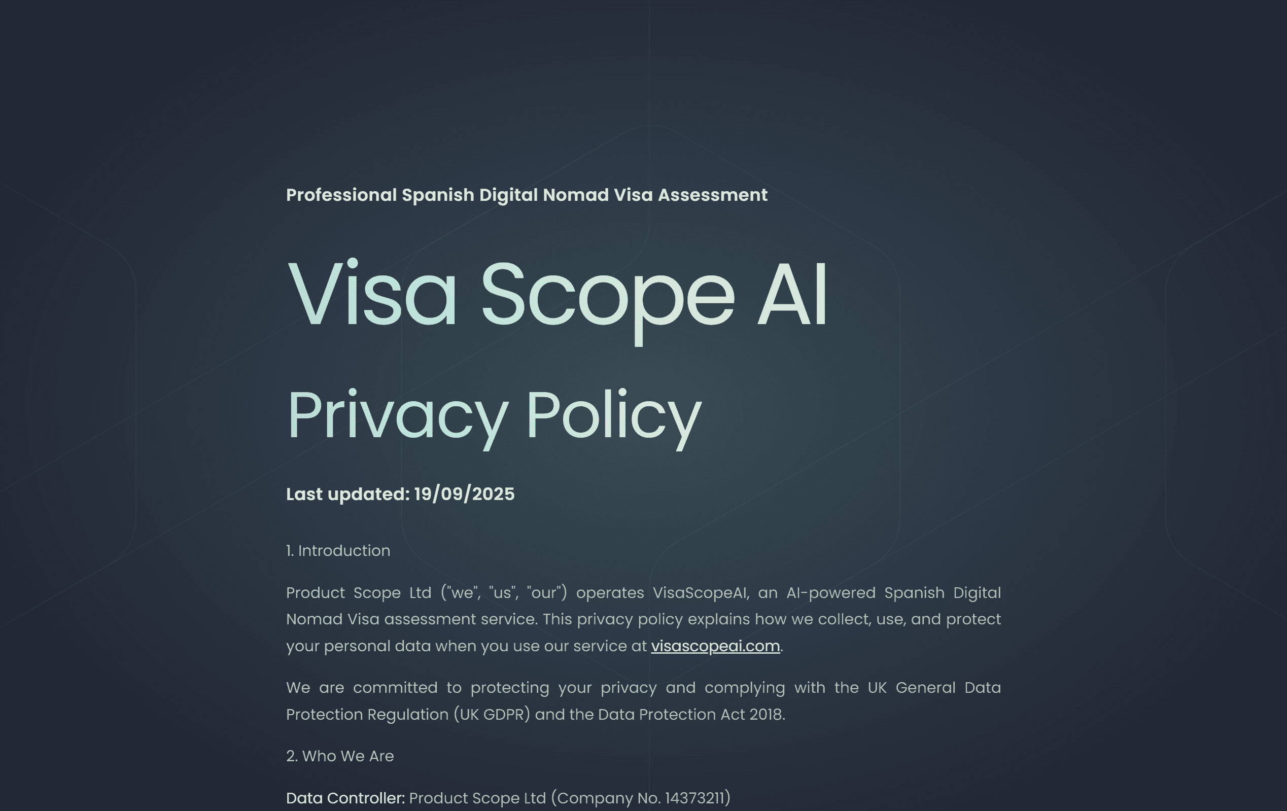 After the data review, I needed to write a privacy policy and terms of service. For both, I created new subdomains (privacy.visascopeai.com and terms.visascopeai.com) and used the same Carrd design, which allowed me to have multiple pages on my site whilst maintaining visual consistency.